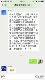 在欢快而热烈的气氛中,“三八节”活动正式开始。老师们在微信群进行签到打卡。接着,高楚兰院长在微信群致辞:对在疫情期间居家做好防疫和教学的老师们致以问候;同时,祝贺所有女教工节日快乐,鼓励大家积极参与活动。