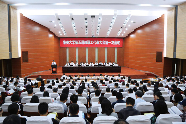 会议表决通过了大会决议(草案),号召全校教职工要更加紧密地团结在以习近平同志为核心的党中央周围,高举中国特色社会主义伟大旗帜,以习近平新时代中国特色社会主义思想为指导,全面贯彻党的十九大精神,不忘初心,牢记使命,凝心聚力、锐意进取,以更加优异的成绩迎接百年校庆,以更加昂扬的斗志朝着有特色、高水平、国内知名的大学努力奋进!
