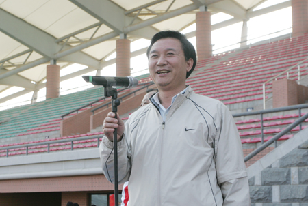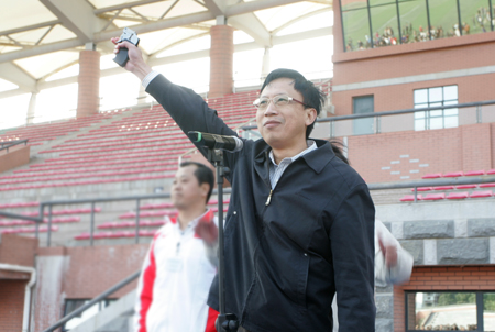辜芳昭宣布集美大学第十届教职工迎新年健步行活动开始,并鸣枪发令。