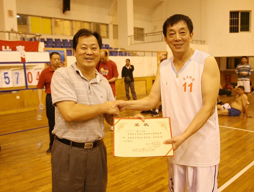 26日下午全部比赛结束后,组委会在体育学院综合训练馆篮球场举行颁奖仪式。裁判长邱红武老师宣布比赛成绩,体育学院副院长、校工会体育部部长施纯志教授为获奖代表队颁发奖状和奖金。(校工会办)