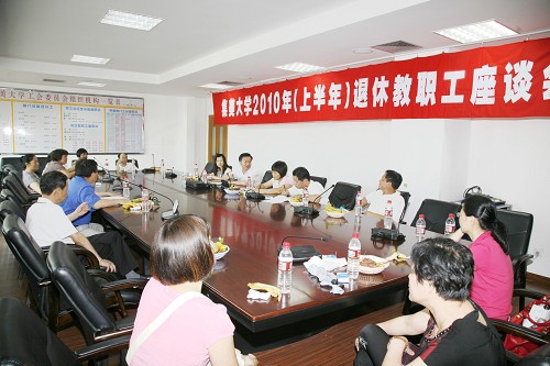 为了解新退休同志的生活情况,听取他们对学校、对工会的意见和建议,7月8日上午,校工会召开2010年上半年新退休教职工座谈会。校党委副书记、纪委书记、校工会主席罗良庚、校工会原主席李金水、校工会副主席陈俊彦、庄东生、校离退休工作处处长王娟出席了座谈会,陈俊彦主持座谈会。