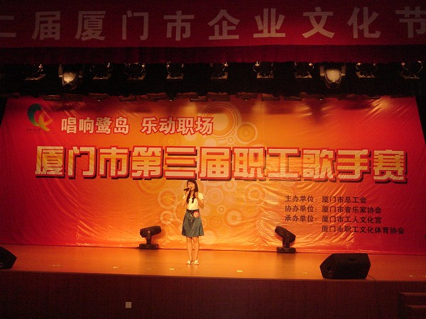 6月16日晚7:00,在市总工会一楼多功能厅举行厦门市第二届企业文化节开幕式暨厦门市第三届职工歌手决赛。市委常委、组织部部长、市总工会主席黄笑影、市委宣传部副部长林书春以及市总工会常务副主席陈永红等有关领导出席开幕式。陈永红作了热情洋溢的讲话。他说,为进一步宣传贯彻党的十七大精神,检阅厦门市企业文化节以来我市各行各业开展企业文化建设的丰硕成果,活跃和丰富全市职工的文化生活,市总工会决定举办第三届职工歌手赛。开展丰富多彩的文化生活,目的是提升企业的文化档次、推动企业文明建设、加快建设海峡西岸经济区的步伐。接着,市委宣传部副部长林书春宣布第二届文化节开幕,厦门市第三届职工歌手决赛正式开始。进入决赛的全市各行各业的32位选手经过3个多时紧张而激烈的角逐,美声、民族、闽南语以及通俗唱法评出各组金、银、铜奖项。我校海外教育学院的许永霞、机械工程学院的叶斐、图书馆的邓玲以及校团委的苏颖四位老师,分别获民族组银奖、通俗组银、铜奖以及民族组优秀奖。在历时半个多月的比赛过程中,预赛和复赛均安排在周末休息时间,她们克服了工作和生活上的困难。特别要提的是,苏颖老师孩子小还在哺乳期,但她还是乐意地接受参加此次的比赛任务。四位老师都认真排练,精心做好赛前的各项准备,充分发挥了演唱水平,取得了优异成绩,为学校赢得了荣誉。