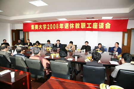 李金水主席首先代表学校领导对在座同志为教育事业做出的贡献表示衷心的感谢,他说:集美大学发展到今天,有这么好的态势,离不开你们的默默奉献,去年,我校本科教学工作水平评估取得了优异成绩,这与大家的辛勤劳动是分不开的,再次感谢你们为学校做出的贡献!今后仍然需要你们为集美大学跨越式发展出谋献策。学校工会每年两次为当年退休的教职工举办座谈会,旨在通过这个平台了解大家退休后的生活情况,了解有否需要工会帮助反映、解决的问题,这也是校工会多年来关心退休职工的优良传统。大家工作上是退休了,但在全民健身运动上,大家应该退而不休,要经常运动,保持一种良好的思想境界,继续为学校、为社会发光发热,也衷心祝愿你们身体健康、笑口常开!