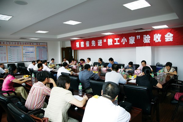 10月17日,福建省高校系统先进“教工小家”(南片)验收会在我校教工活动中心举行。验收组由福建省总工会教科文卫体工会工作委员会主任方清、副主任张元闽、厦门市总工会科文卫体工委主任康鹭佳、福建农林大学工会常务副主席王秀珍、福州大学工会常务副主席郑翔等6位领导和专家组成。厦门大学、华侨大学、漳州师范学院等兄弟院校工会的领导和老师,我校工会主席李金水、副主席骆朝泉、陈俊彦、信息工程学院党委书记朱凤君、政法学院党委书记庄丽榕等出席验收会。