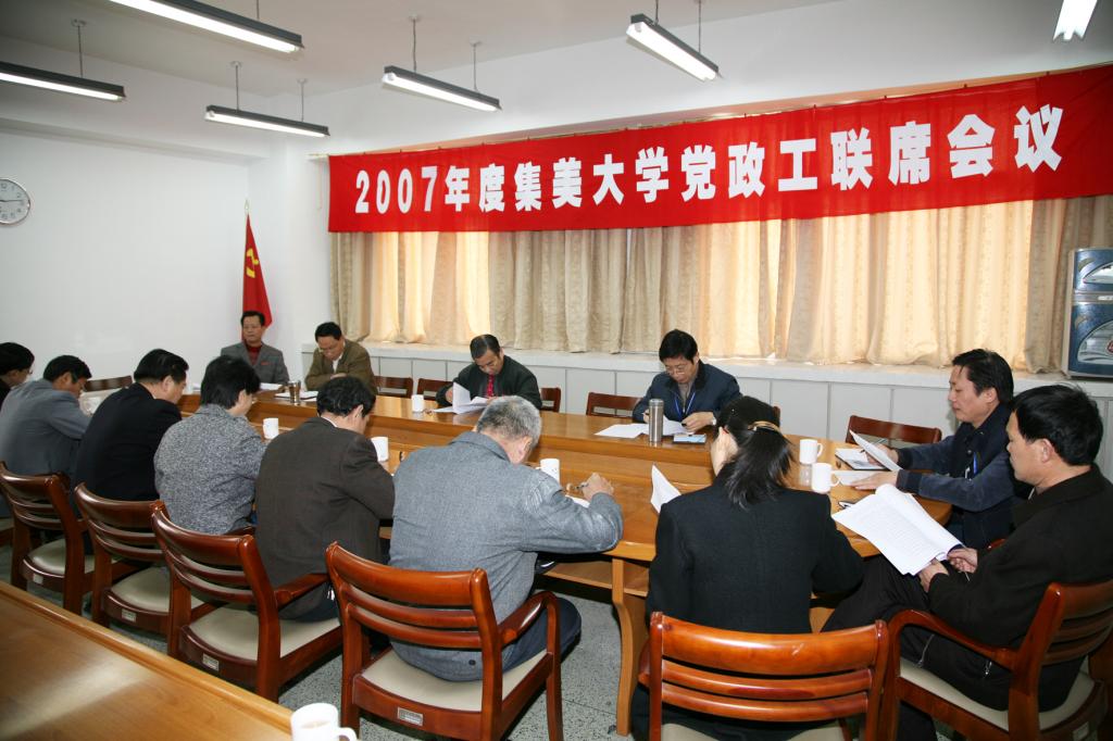 1月15日,2007年度集美大学党政工联席会议在校部十一楼会议室举行。出席会议的校领导有辜建德、林耀坤、邱元拔、关瑞章、李金水以及校党政工共建“教工之家”领导小组成员、有关职能部门负责人许碧凤、骆朝泉、周学智、郑志谦、黄爱斌、徐德辉、柯细辉、王仁敬、高伯乐等同志。会议由辜建德校长主持,