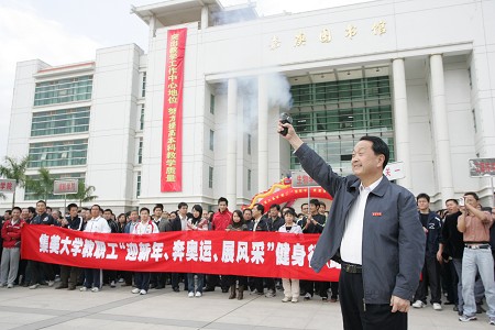 开幕式由校工会副主席骆朝泉主持。校工会主席李金水发表了热情洋溢的讲话,他向全校教职工表达了节日的祝福,并对广大教职员工在刚刚过去的教育部本科教学工作水平评估中所做的努力表示了崇高的敬意,他希望全校广大教职员工以2008奥运年为契机,积极投身体育锻炼,不断提高身体素质,不断提高工作水平,不断提高工作质量。下午4:10,随着张向中书记手中的发令枪一声枪响,诚毅学院方队首先冲出起跑线,三千多名教职工从嘉庚图书馆门口广场出发,途经引桐楼、西苑餐厅、信息工程学院、教学楼、陈延奎图书馆、计算机工程学院、工商管理学院、海外教育学院等再返回嘉庚图书馆,全程约2.5公里。教职工们在健步走(跑)活动中不仅增强了身体素质,同时又浏览了新校区美丽的风光景色。