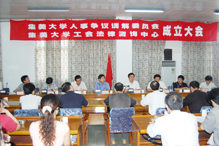 市总工会副主席陈永东也作了热情洋溢的讲话,他指出,集美大学人事争议调解委员会暨工会法律咨询中心,选择在将于10月1日实施的全国《人事争议处理规定》前成立是很有意义的,因此,希望集美大学工会,在学校党委的领导下,做好这两个组织机构的工作;要充分利用学校的有关资源,把人事争议调解委员会和法律咨询中心办成师生欢迎和信赖的机构;要加大宣传力度,工会对学校重大决策的制定要积极参与、靠前参与,通过大家的努力,把教职工的矛盾消除在萌芽状态,为构建和谐校园做贡献。