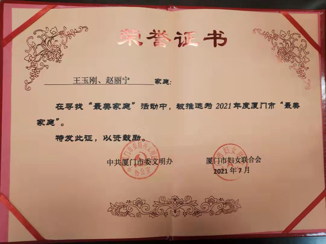 近日,由厦门市妇联、厦门市委文明办联合开展的“2021年度寻找最美家庭活动”结果揭晓,我校海洋装备与机械工程学院王玉刚家庭获“2021年度厦门市最美家庭”。