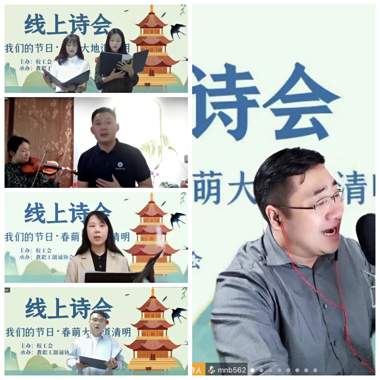 4月5日晚,“我们的节日·春萌大地道清明”线上诗会通过腾讯会议平台举办。本次诗会由校工会主办、教工朗诵协会承办。诗会分“怀校主”“思亲人”“敬中华”三个篇章,征集演出节目15个。来自各部门工会的教职工在线上齐聚一堂,朗诵《永远的陈嘉庚》《蝶恋花答李淑一》《不朽》等经典诗歌,海洋文化与法律学院学生也带来原创诗歌朗诵。师生们以饱满的激情吟诵经典、感怀清明,在诗歌中缅怀校主、崇敬英雄、赞颂祖国。