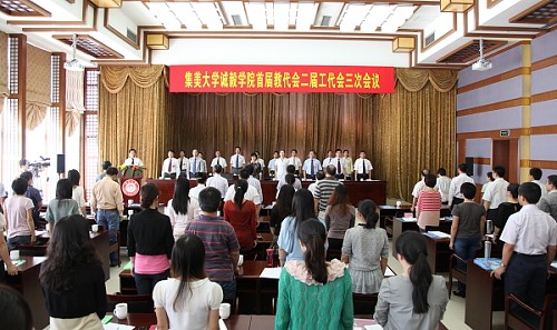 叶美萍在讲话中指出,“十二五”期间是诚毅学院进一步深化内涵建设,全面提高教育教学质量,实现新的历史跨越的关键时期。她同时提出三点意见和希望:第一,全体教职员工要以学位评审为契机,扎实做好迎评的各项准备工作,确保顺利获得学士学位授予权;第二,各基层党组织和广大党员要在迎评促建工作中充分发挥作用,力促学院的事业迈上新台阶;第三,全体代表要认真履行职责,要进一步发挥好学院“双代会”的积极作用。