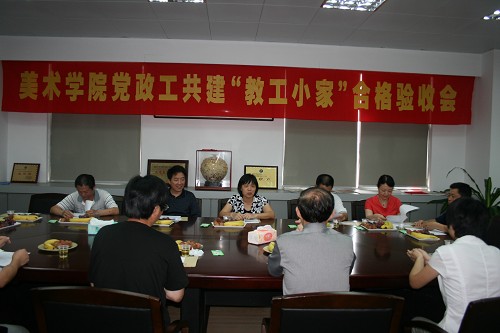 在综合汇总各方面的情况后,陈俊彦代表验收组反馈验收的意见,她首先对我院近年来在建家工作中所取得的成绩予以充分肯定,认为美术学院党政领导重视建家工作,凝聚力强;美术学院以专业特点建家,教职工认可度高。同时也希望今后再接再励,克服存在的不足,争取更好成绩。校工会副主席庄东生也在会上给予较高的评价与鼓励。验收组成员外国语学院党委书记、部门工会主席车军也介绍了工会建家经验。
