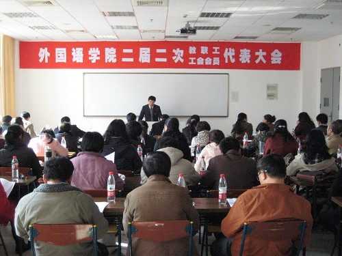 2011年1月7日下午,外国语学院召开二届二次教职工暨工会会员代表大会。校工会副主席庄东生、外国语学院党政领导及54名代表参加会议,会议由赖招仁副院长主持。